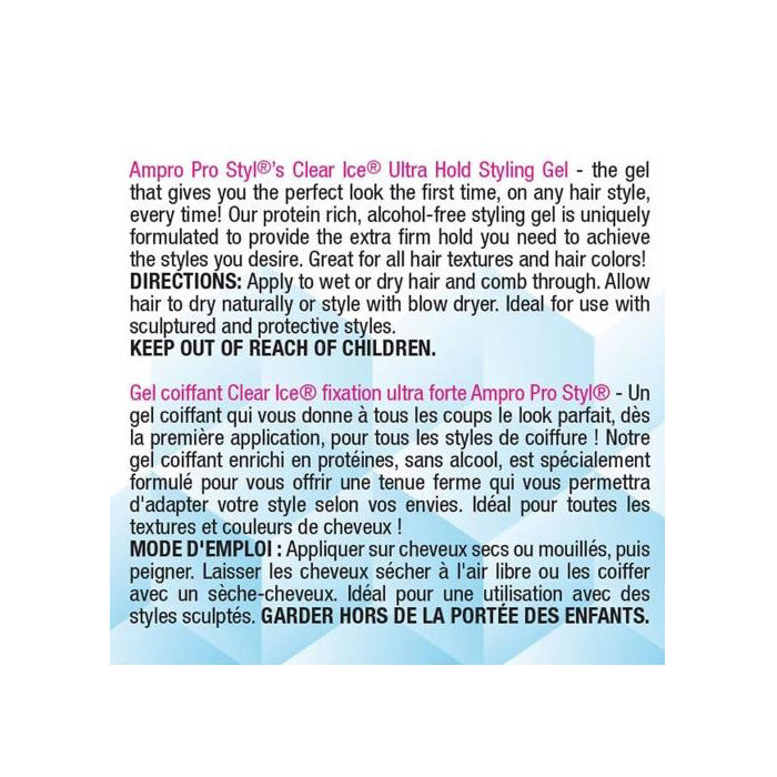 Ampro Style Clear Ice Ultra Hold Styling Gel 8.8 Oz BRAND : Ampro StyleTYPE: GelINGREDIENTS: Water/Aqua, Propylene...